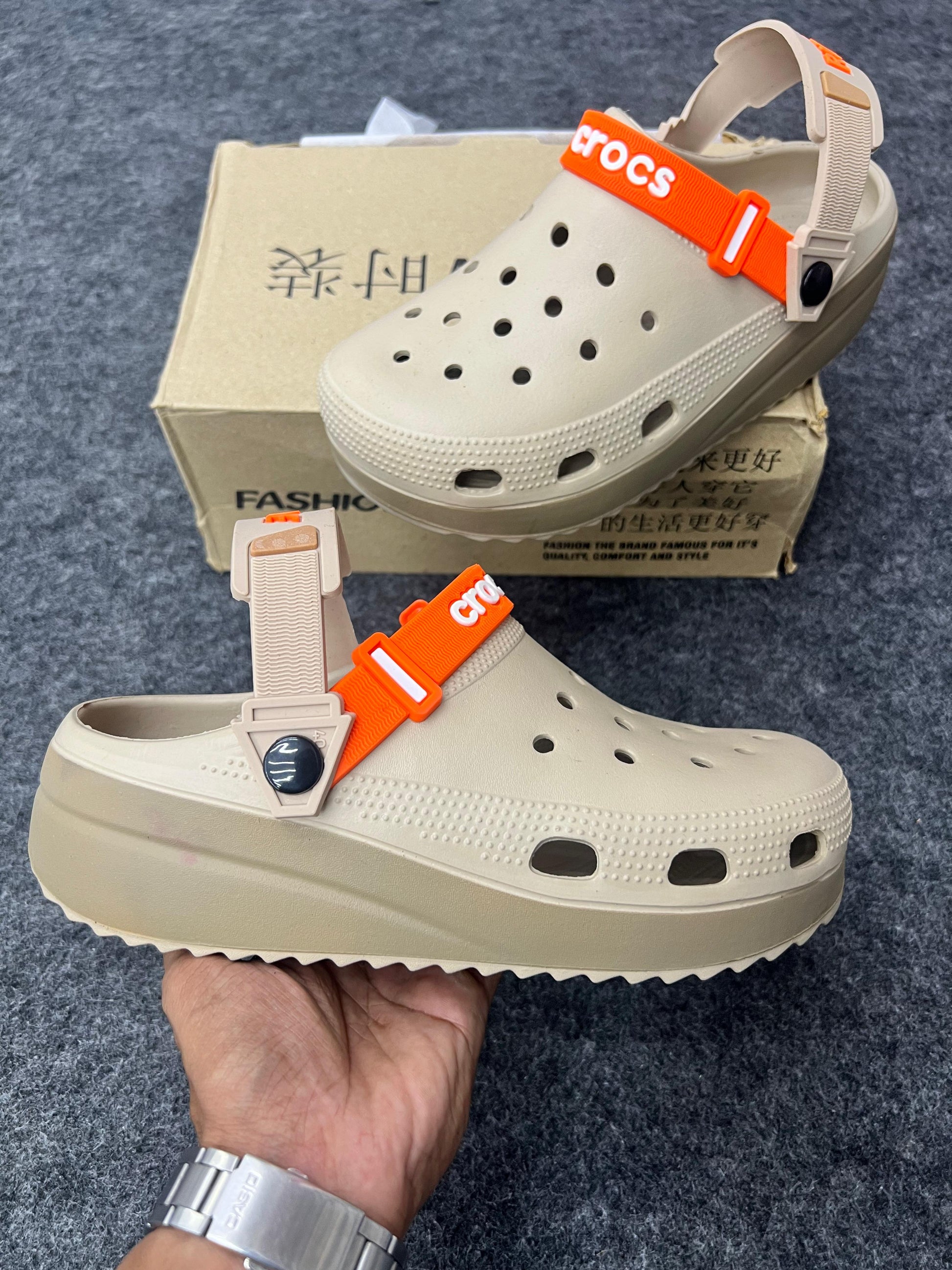 Step up your casual style with these Beige Platform Crocs featuring a bold orange adjustable back strap for a secure fit. Designed with lightweight Croslite™ foam, these Crocs deliver all-day comfort, durability, and water-friendly versatility. The ventilated upper ensures breathability, while the chunky platform sole adds a trendy touch, making them perfect for both comfort seekers and fashion lovers. Ideal for everyday wear, indoors or outdoors.
