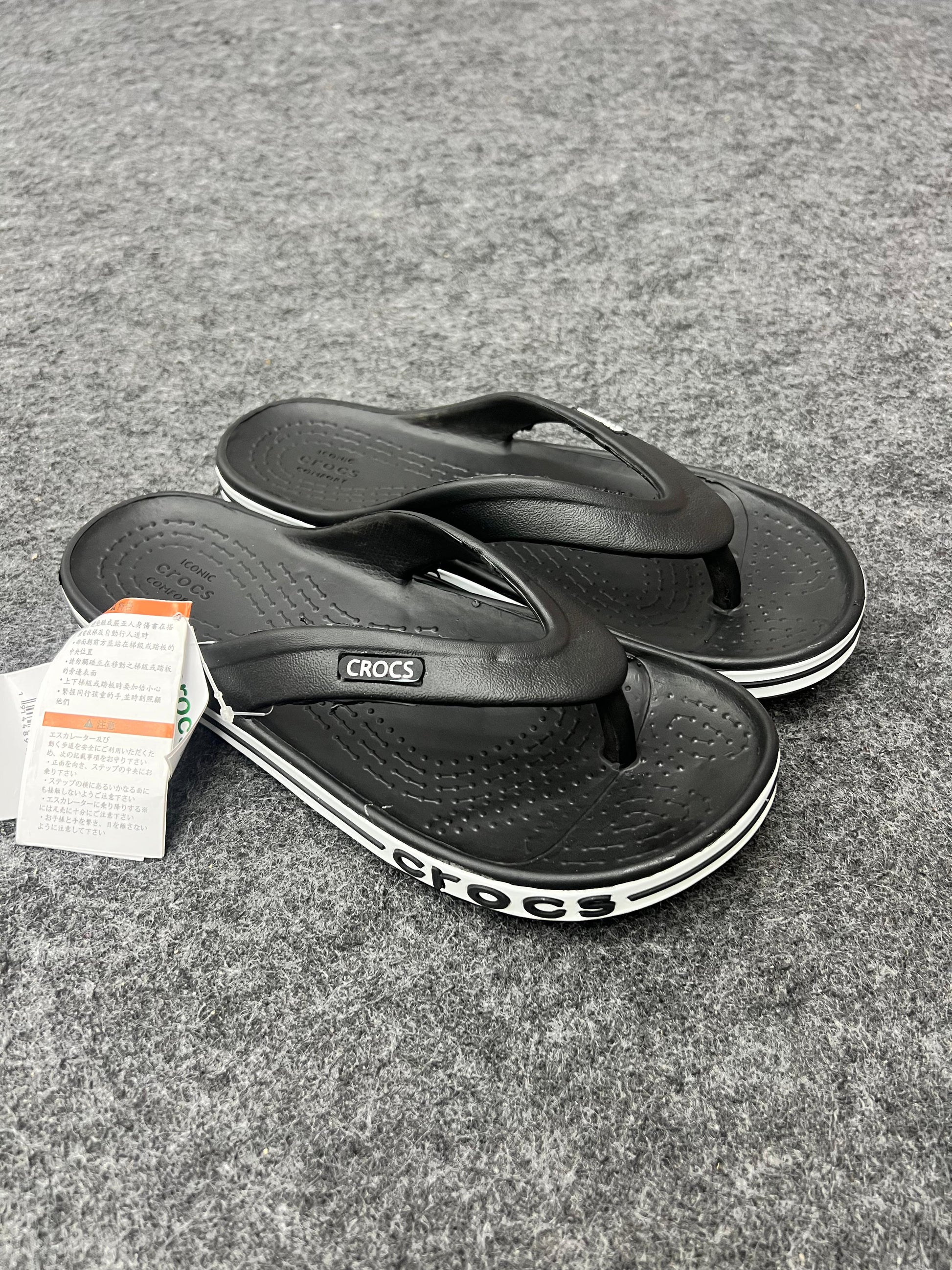 Keep it sleek and comfortable with these black Crocs flip-flops. Made from lightweight Croslite™ material, they deliver soft cushioning and long-lasting support for everyday wear. The textured footbed offers a gentle massage feel while ensuring a secure step. With the Crocs logo detailing on the strap and bold branding along the midsole, these slippers are perfect for casual outings, beach days, or relaxed home wear. Easy to clean, quick-drying, and durable, they’re a go-to for all-day comfort and style.