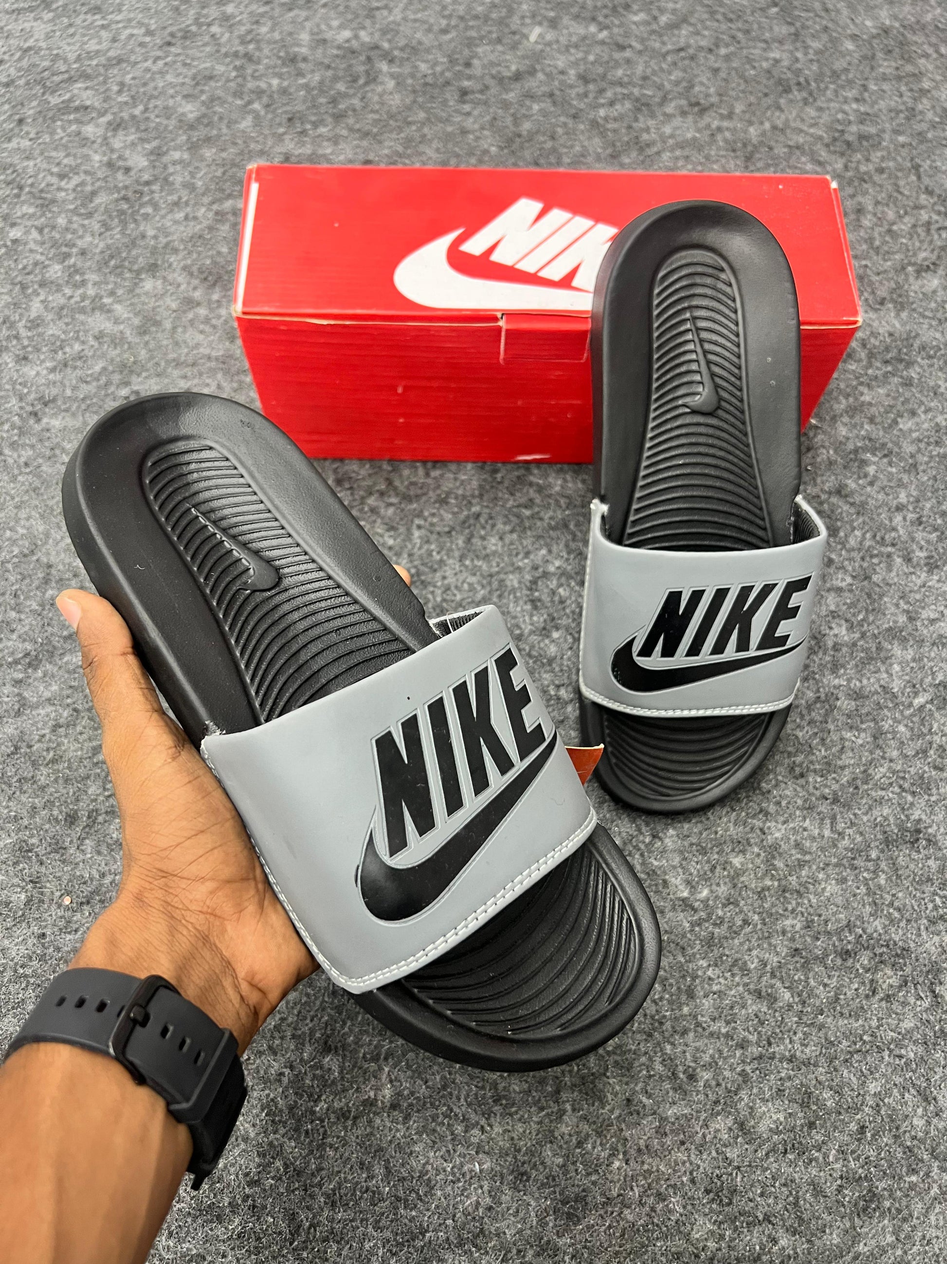 These Nike slides combine comfort with a cool, minimal look. Featuring a sleek grey strap with bold black branding, they offer a cushioned footbed and textured sole for everyday grip and support—perfect for casual wear.